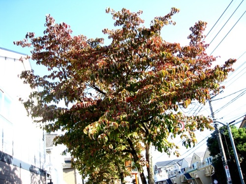 赤い実を付けるハナミズキと街路樹 しましまの猫